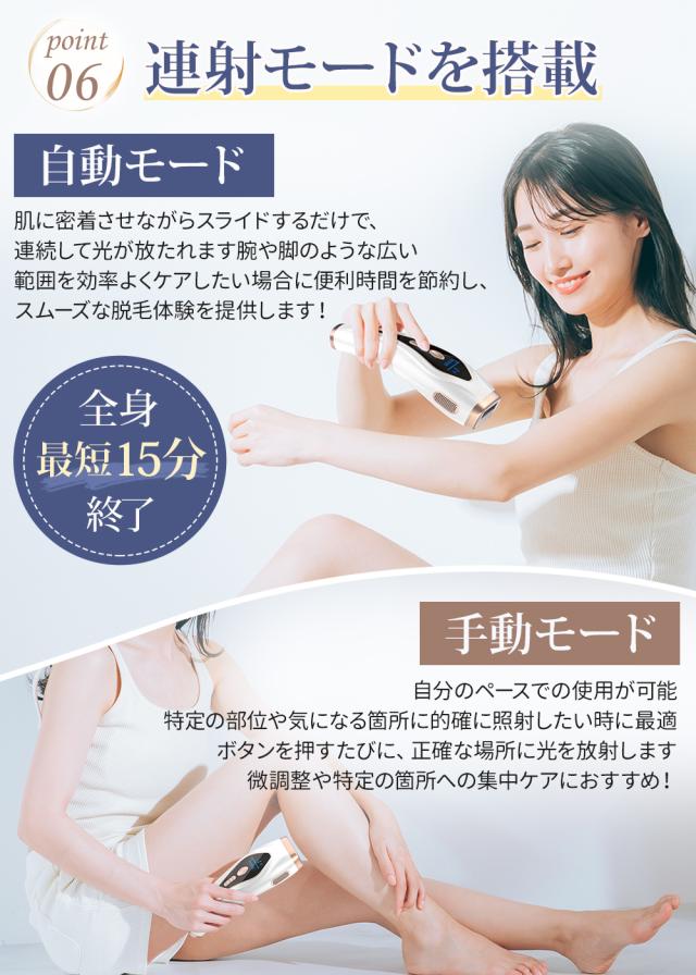 脱毛器に電源を入れると、自動的に手動モードになります。照射ボタンを一回押すと一回照射されます。手動照射モードは小範囲の脱毛に適している。照射ボタンを長押しで自動照射モードに切り替わる。自動照射モードは広範囲の脱毛に適しています。