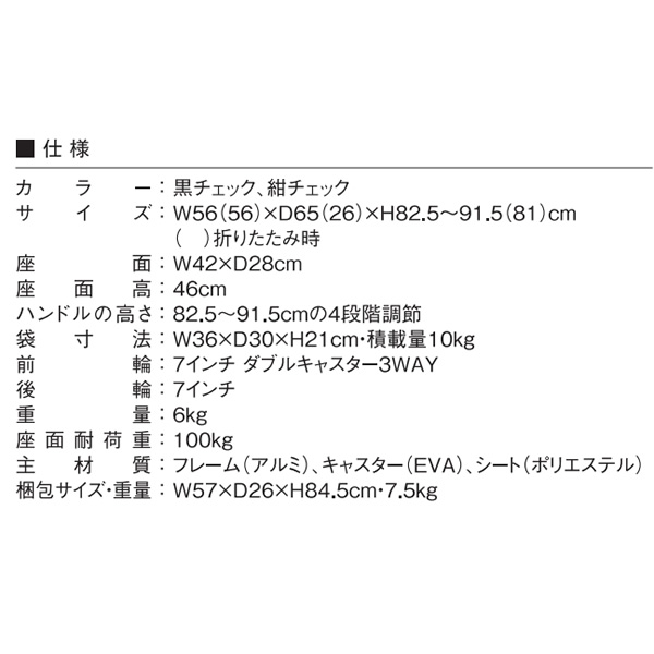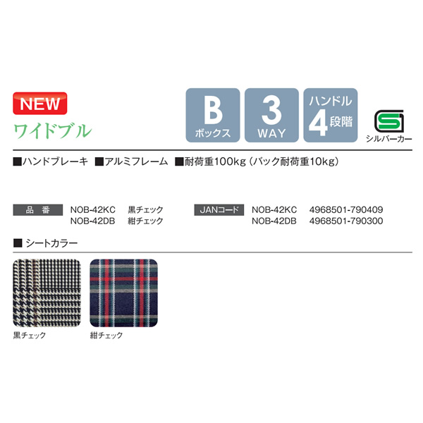 ●座幅42cmのワイドタイプ ●大容量の袋部 大容量の袋部はお買い物時に安心。袋部の耐荷重は10kg。 ●駐車ブレーキ 右側サイドに駐車ブレーキレバーがついております。 ■メーカー:マキテック ■品名:シルバーカー ワイドブル ■特徴:座面幅42cmのワイドタイプ! ■品番:NOB-42KC ■シートカラー:黒チェック ■ハンドル高さ調整は82.5-91.5cmの間で無段階調整が可能、4段階調整 ■サイズ: 全幅56×全高82.5〜91.5x全長65cm 折りたたみ時:全幅51×全高81x全長25cm 袋寸法:W36×D30×H21、バッグ容量:2.7L 座面寸法:W42×D28cm 座面高:46cm ■重量 6.0kg ■耐荷重 100kg ■材質: 本体:フレーム(アルミ)、キャスター(EVA)、 シート(ポリエステル) ※記載は商品仕様の一部です。仕様説明不足等の理由での返品はできません。特に適合等は必ずご確認ください。