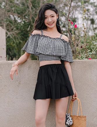 水着 オフショルダー フレアビキニ 体型カバー 二の腕 お腹 お尻 太もも 日焼け防止 UV対策 ジム スポーツ 黒 夏 リゾート 海 ビーチ 温泉 プール 海水浴 水泳 バカンス 盛れる セクシー 大人可愛い レトロ キュート 10代 20代 30代 トレンド 人気