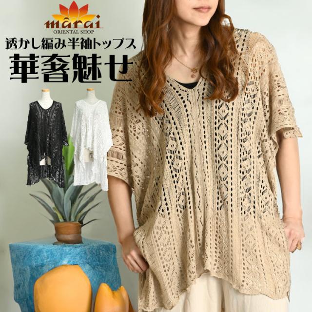 透かし編み ニット 半袖 ブラウス レディース 華奢魅せ。透かし編み半袖トップス クロシェ編み rb61074 トップス クロシェ編みニット トップス レース プルオーバー ゆったり 大きいサイズ 重ね着 着痩せ