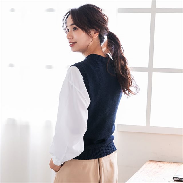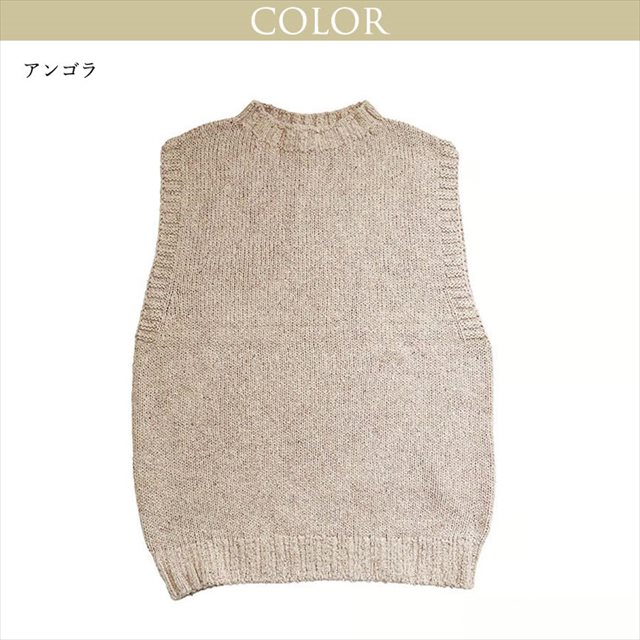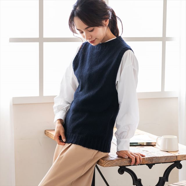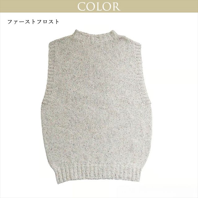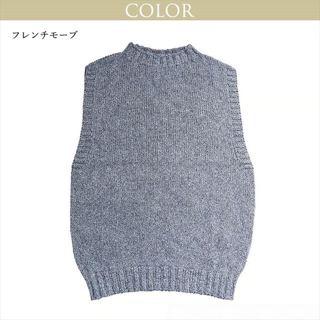シャツやブラウスなどとあわせてアレンジして頂けるモダンなシルエットで襟首は詰まりすぎず開きすぎないモックデザインのベストです。カジュアルな風合いが特徴のシルク糸で空気を含ませながら編み上げたベストは、見た目より軽い仕上がりで年中ご愛用頂けます。新しくアンゴラ、フレンチモーブ、ファーストフロストが登場致しました。