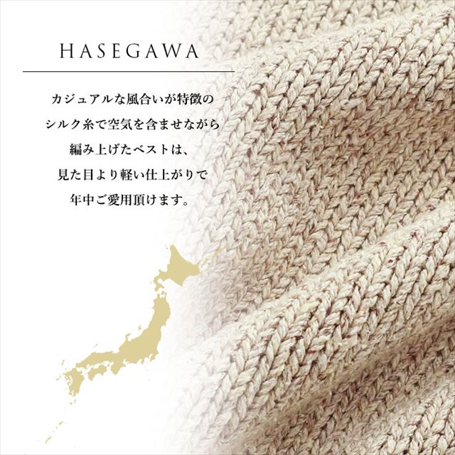カジュアルな風合いが特徴のシルク糸で空気を含ませながら編み上げたベストは、見た目より軽い仕上がりで年中ご愛用頂けます。