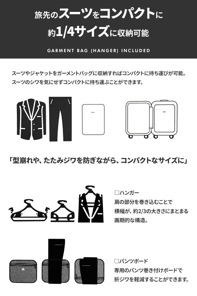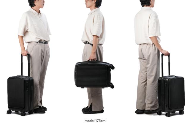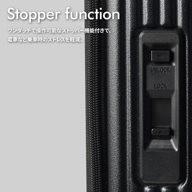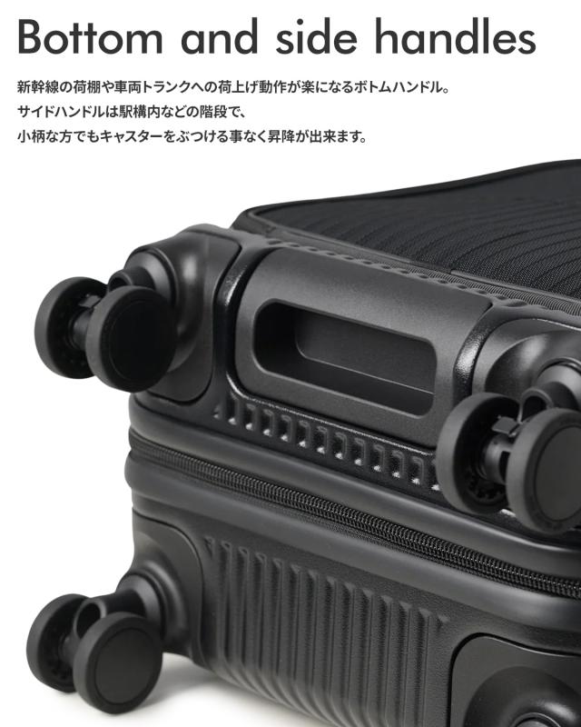 | ■ 軽量・耐衝撃性・柔軟性 フロントパネル部には柔軟で衝撃吸収力のあるEVA素材を採用。メイン部は軽量で耐衝撃性に優れたポリカーボネートを使用。ハイブリッド素材により軽量かつ強力な耐衝撃性を備え、内容物を守ります。異なる素材の組み合わせとベーシックなボディーカラーによりシックで落ち着いた雰囲気のスーツケースとなっています。 ■ クイック収納 フロントパネル部分が柔らかいEVA素材となっている為、ファスナーを全開することなくフロント部の荷物の収納が可能。移動中での荷物の取り出しがとてもスムーズです。フルオープンも可能で、宿泊先でもフロントポケット側から荷物へアクセスが可能です。 ■ 静かでスムーズな安定性走行 日乃本錠前社 Lisof® 消音双輪キャスターを装備。静かで安定性抜群の走行が可能です。 ■ 電車内や坂道に便利なブレーキシステム ON/OFFの切り替えだけでスムーズにキャスターストッパー操作を行うことができます。 ■ 移動や持ち運びに便利なハンドル ップ・サイドハンドルは、階段利用時などでの持ち運びをサポートします。ボトムハンドルは、両手でスーツケースをしっかりと持つことができ、上下移動の負荷を軽減します。 ■ 段階調整可能なキャリーシステム お好みに合わせて3段階調節することができます。外付けキャリーバーで容量アップ。 ■ 安心のTSAダイヤルロック 暗証番号だけで施錠・解錠できるダイヤルロック。キーを持たずにご利用いただけます。 ■ 旅先でのスーツをコンパクトに収納 本製品にはガーメントバッグが付属します。付属のハンガーは肩の部分を巻き込むことで横幅が約2/3の大きさにまとまる画期的な構造です。パンツボードの片面はメッシュポケット仕様で小物を収納するのに便利です。 スーツの型崩れやたたみジワを防ぎながら、コンパクトなサイズにすることができます。ガーメントバッグとして使用しない場合、パンツボードは荷物を抑えることができる中仕切りとしてもご使用いただけます。 |