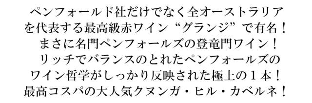 ペンフォールド社だけでなく全オーストラリア を代表する最高級赤ワイン“グランジ”で有名! まさに名門ペンフォールズの登竜門ワイン! リッチでバランスのとれたペンフォールズの ワイン哲学がしっかり反映された極上の1本! 最高コスパの大人気クヌンガ・ヒル・カベルネ!
