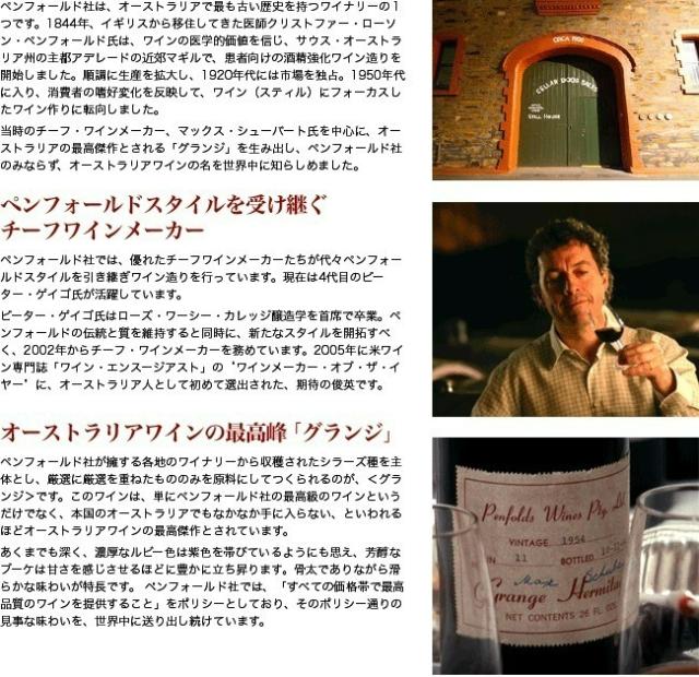 グランジはペンフォールドのみならずオーストラリアのフラッグシップワインとして象徴的な存在となっています。1951年(実験的な瓶詰)以来とぎれるころなく「サウスオーストラリアの土壌と天候とシラーズ」の相乗効果を体現してきたことを誇ります。本国のオーストラリアでもなかなか手に入らないと言われるほどオーストラリアワインの最高傑作とされています。完熟し凝縮した質感を持つシラーズとアメリカンオークの新樽との組み合わせから生まれた、無二のオーストラリアンスタイル"世界で最も一貫したワインスタイルのひとつ"として認識されています。グランジスタイルとは、ペンフォールドの「マルチヴィンヤード(複数畑)、マルチディストリクト(複数栽培地域)ブレンディング」の理念をもっとも力強く表現している、オリジナリティあふれるワインです。