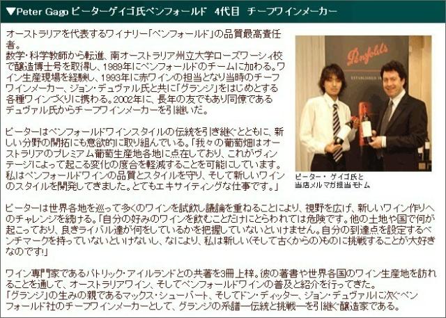 ペンフォールド社では、優れたチーフワインメーカーたちが代々ペンフォールドスタイルを引き継ぎワイン造りを行っています。現在は4代目のピーター・ゲイゴ氏が活躍しています。ピーター・ゲイゴ氏はローズ・ワーシー・カレッジ醸造学を首席で卒業。ペンフォールドの伝統と質を維持すると同時に、新たなスタイルを開拓すべく、2006年からチーフ・ワインメーカーを務めています。2005年に米ワイン専門誌「ワイン・エンスージアスト」の“ワインメーカー・オブ・ザ・イヤー”に、オーストラリア人として初めて選出された、期待の俊英です。