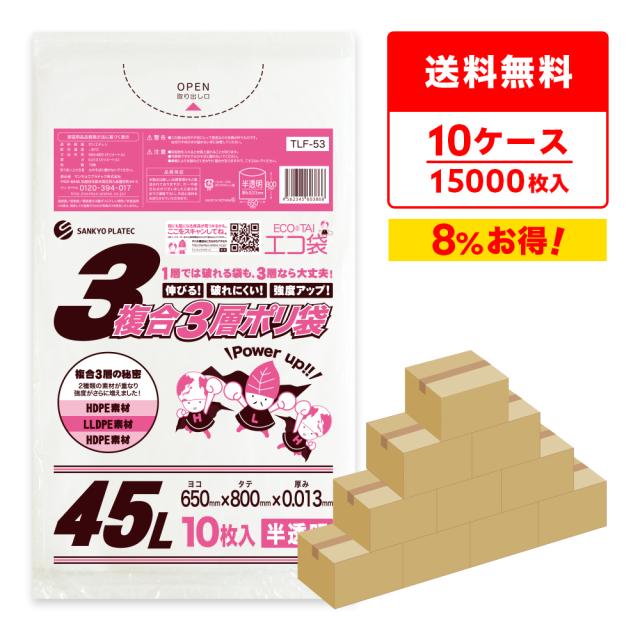 ごみ袋 複合3層 ポリ袋 45リットル 半透明 65x80cm 0.013mm厚 10枚x150冊x10箱 TLF-53-10/ ゴミ袋 平袋 袋 45l ナチュラル 業務用 送料無料