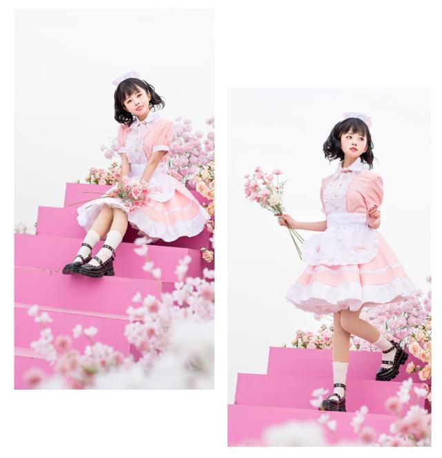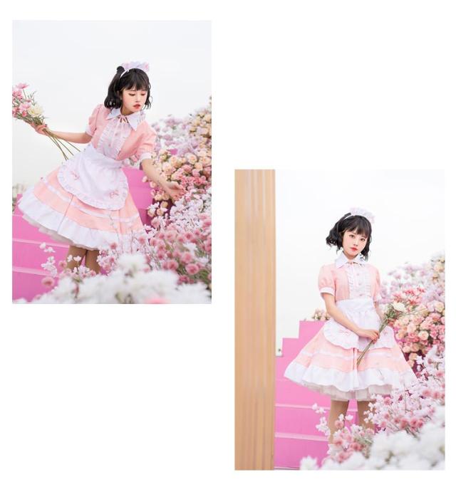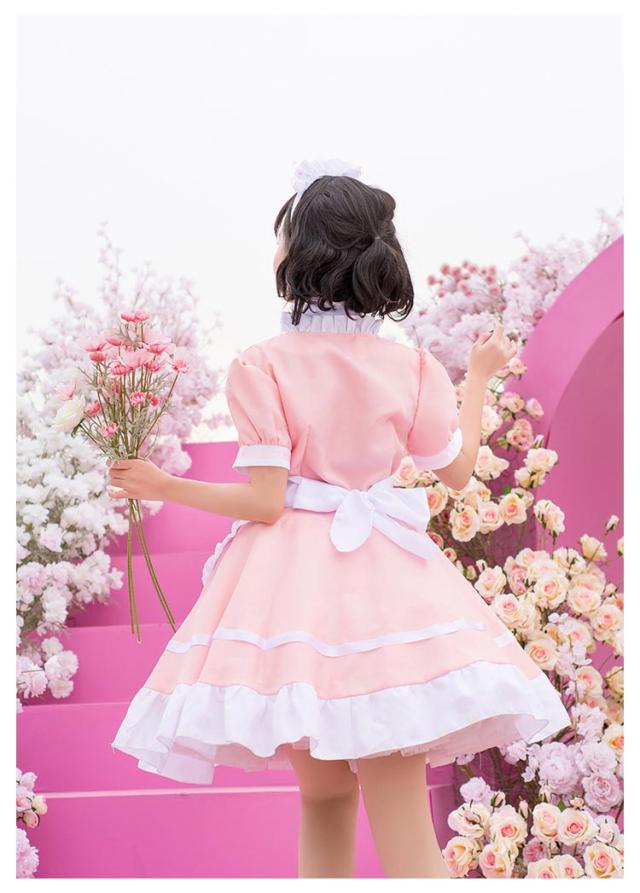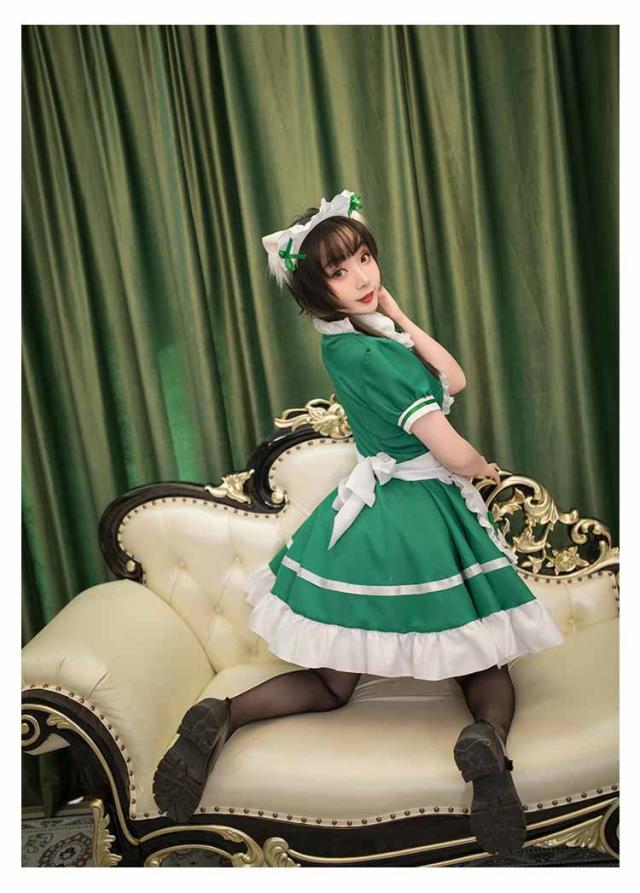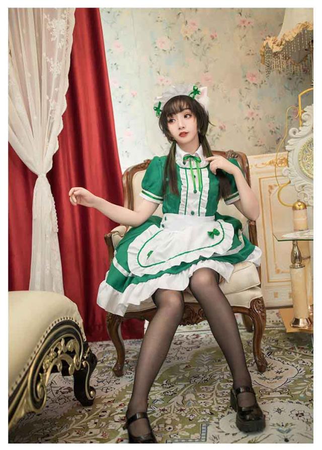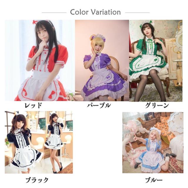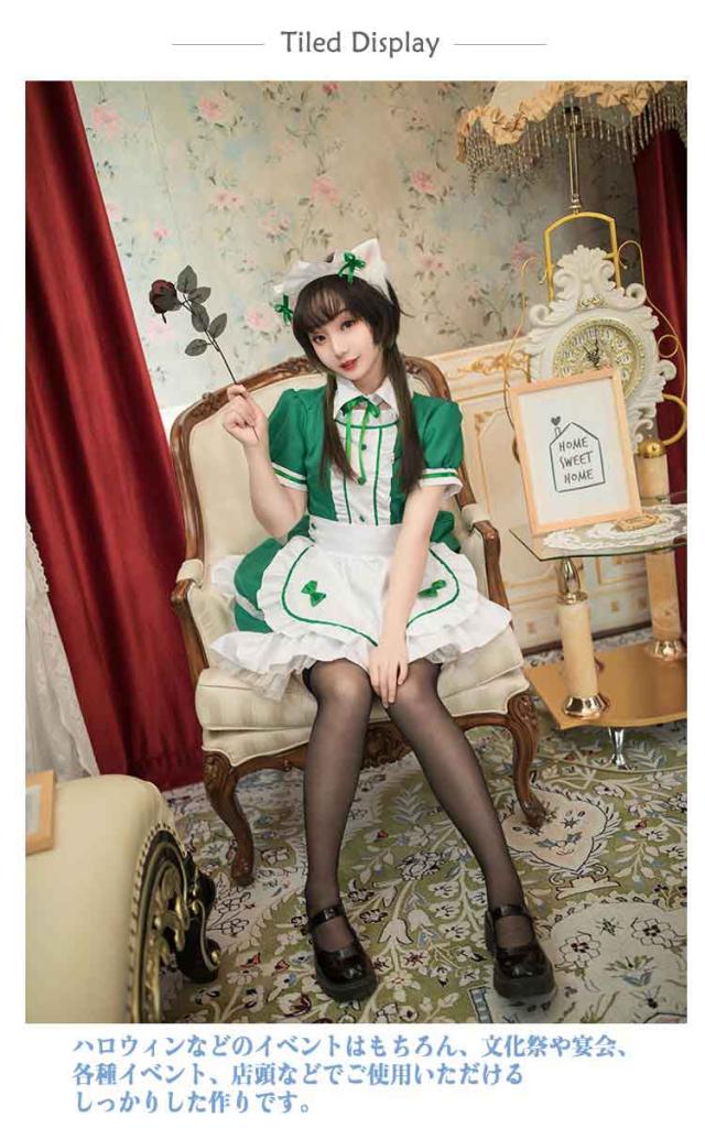 | 定番の清楚系メイド服です。 背面は大きなエプロンリボンで女の子らしさを強調し、パフスリーブの袖口がとてもキュートです。 ハロウィンなどのイベントはもちろん、文化祭や宴会、各種イベント、店頭などでご使用いただけるしっかりした作りです。 | |