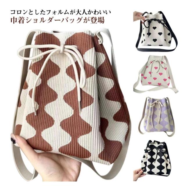 ニットバッグ ショルダーバッグ レディース 巾着 かごバッグ ショルダー ニット バッグ 韓国風 かばん 鞄 巾着バッグ ミニバッグ ハート ストライプ オールシーズン 軽量 軽い 収納 マチ付き サマーバッグ ハンドバッグ