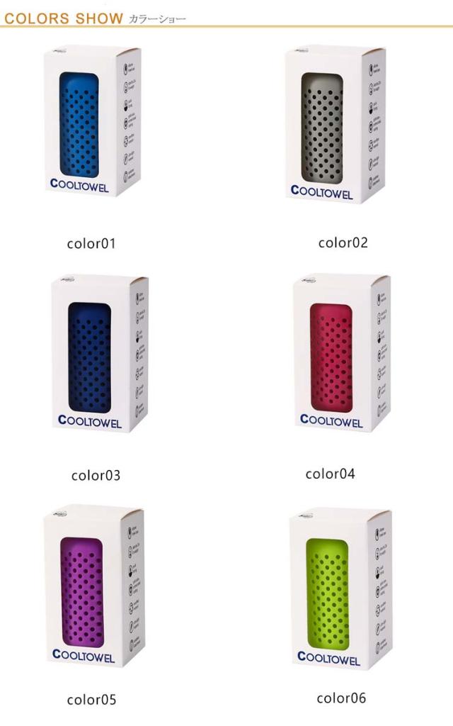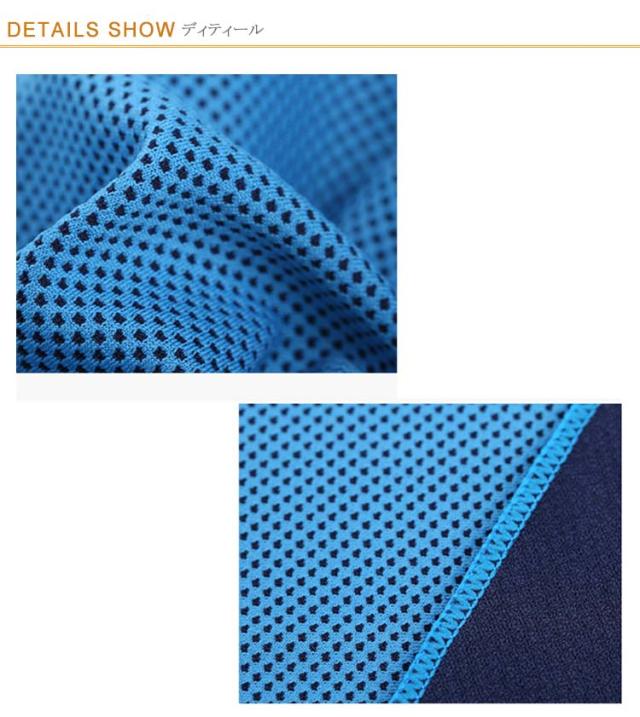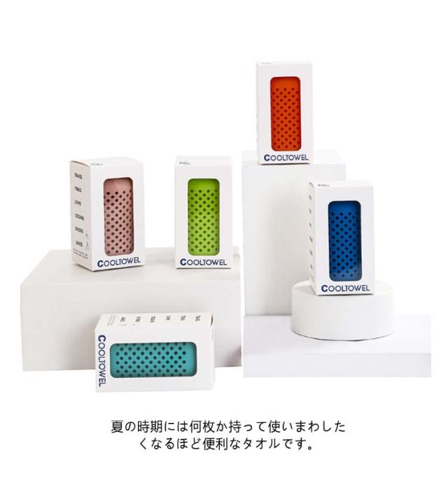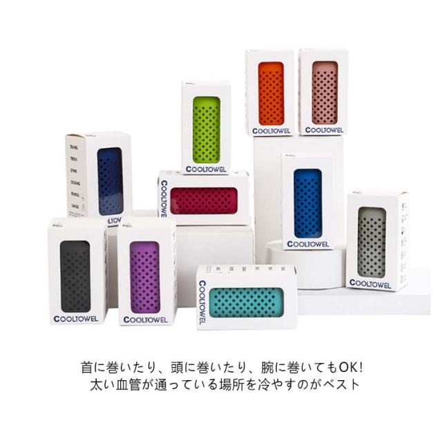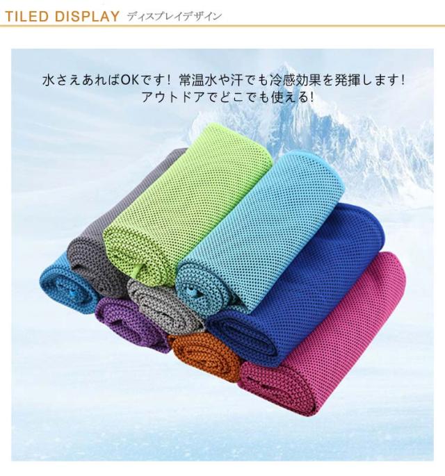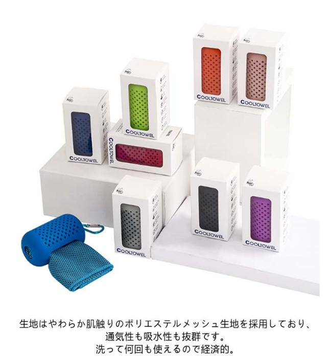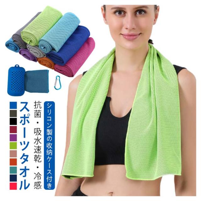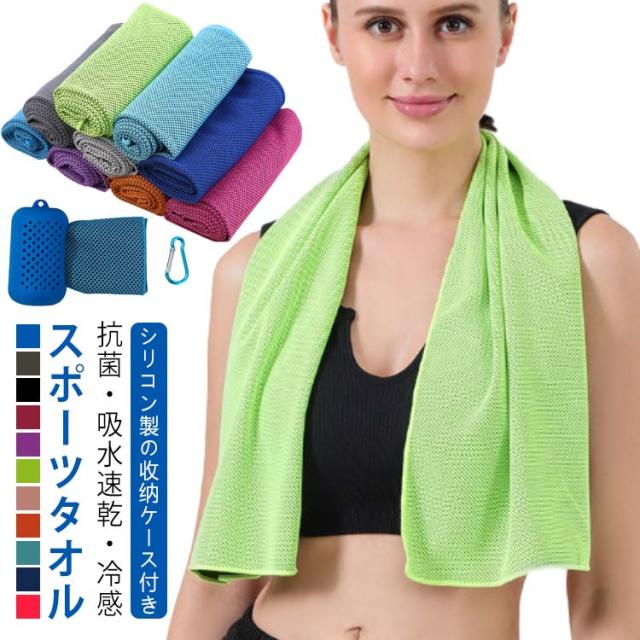 | 夏の暑さ対策、熱中症対策に! 抗菌・吸水速乾・冷感 スポーツタオル 100×30cm 【シリコン製の收?ケース付き】 夏の暑さ対策や熱中症対策に! 濡らして振るだけで一瞬にしてひんやりと冷たくなる冷感クールタオルです。 スポーツ観戦やアウトドア、ジムや工場など、屋内屋外問わず暑くてどうしようもないときありませんか? そんなときに通気性・吸水性抜群のひんやり快適クールタイルが大活躍します。 この商品は効果的に気化熱を生み出す構造になっており、濡れたタオルが蒸発することで一緒に熱を奪うため冷たくなるのです。 水さえあればOKです!常温水や汗でも冷感効果を発揮します! アウトドアでどこでも使える! 生地はやわらか肌触りのポリエステルメッシュ生地を採用しており、通気性も吸水性も抜群です。 洗って何回も使えるので経済的。 首に巻いたり、頭に巻いたり、腕に巻いてもOK! 太い血管が通っている場所を冷やすのがベスト♪ 夏の時期には何枚か持って使いまわしたくなるほど便利なタオルです。 | |