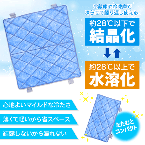- お試しで買ってみました。涼しくて良いのですが 薄型のためか、トケルのが思ったより早いようです。2枚重ねて試してみました。良い感じですが装着に手間がかかります。