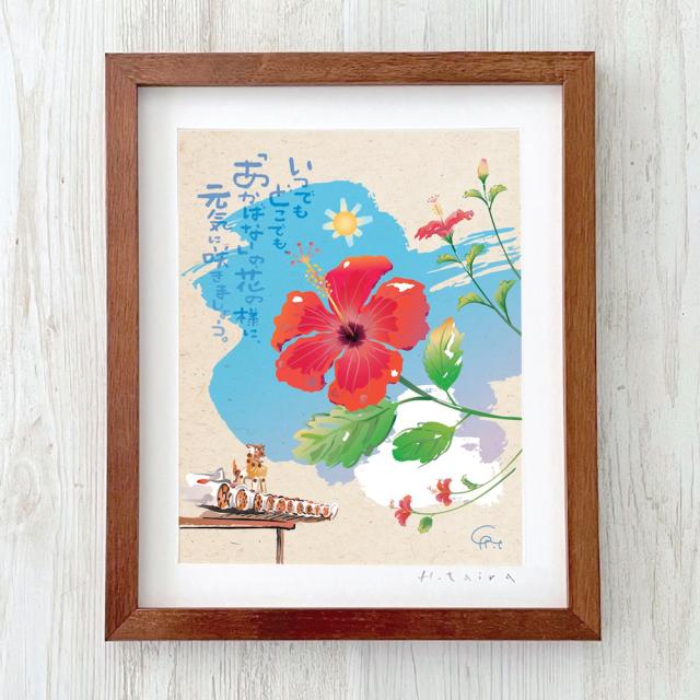 沖縄を拠点に世界で活躍するグラフィックデザイナー「平良ヒトシ」が描く、色鮮やかな南国の温かい色やかたちを楽しく優しいタッチで描いた色鮮画を落ち着いた木目のフレームに入っています。