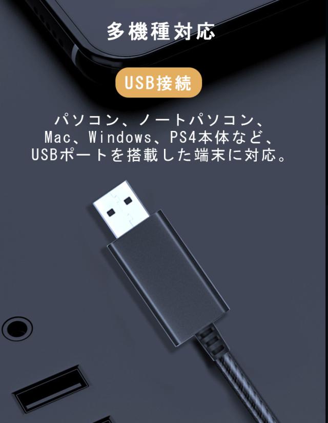 パソコン、ノートパソコン、Mac、Windows、PS4本体など、USBポートを搭載した端末に対応。