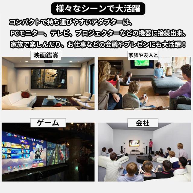 充電と視聴を同時にLightningケーブルを利用しながらなので、充電切れの心配をせずに、長時間の動画視聴も安心。手のひらサイズで僅か14g。コンパクトで持ち運びやすいアダプターは、PCモニター、テレビ、プロジェクターなどの機器に接続出来、家族で楽しんだり、お仕事などの会議やプレゼンにも大活躍!