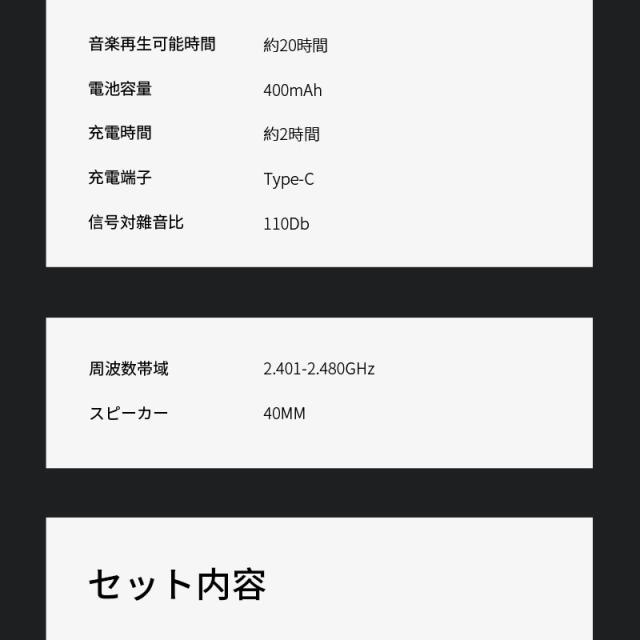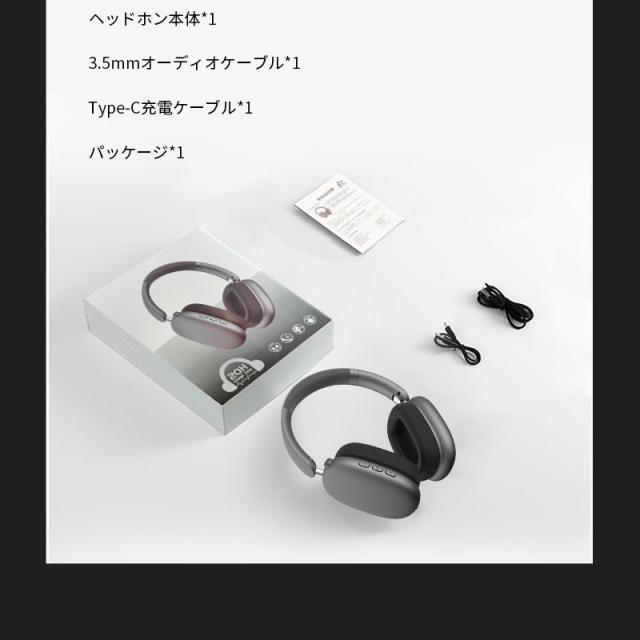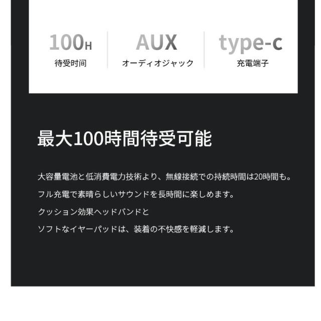 【パッケージ内容】ヘッドホン、Type-C充電ケーブル、オーディオケーブル、日本語取扱説明書。