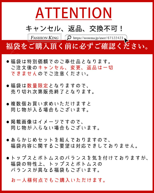 ●トップスとボトムスのバランスを気を付けておりますが、福袋の特性上、トップスとボトムスのバランスが異なる福袋もございます。