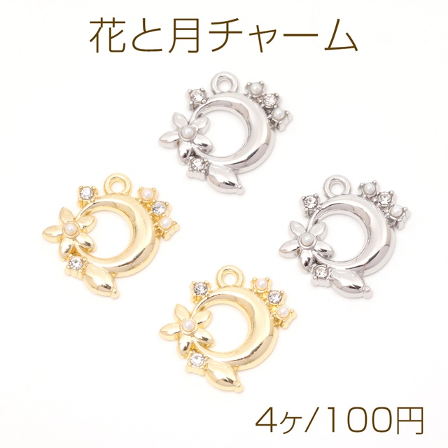 花と月チャーム フラワーとムーンチャーム メタルチャーム パールとラインストーン付き 1カン付き 約17×18mm(4ヶ)