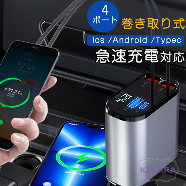 車載充電器 シガーソケット スマホ充電器 巻き取り式 急速充電 Type-C Lightning リール式 4台同時充電 巻取り式ケーブル カーチャージャー12V車 24V車後部座席充電 電圧計 カー用品 iPhone Android