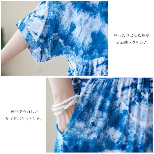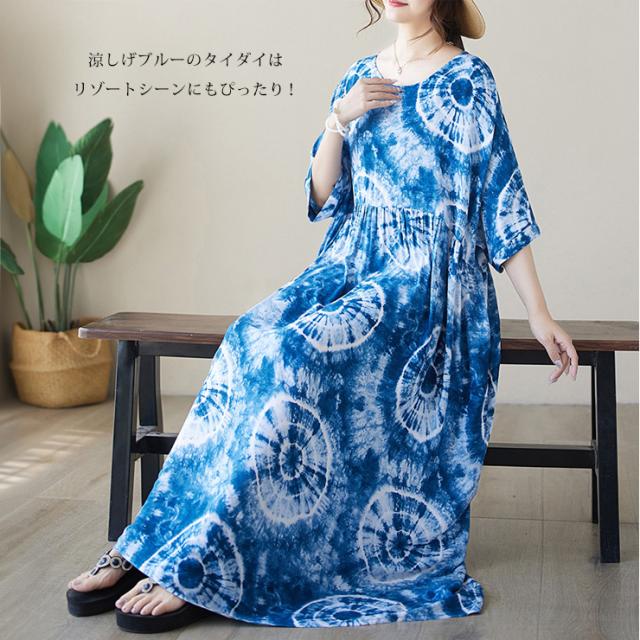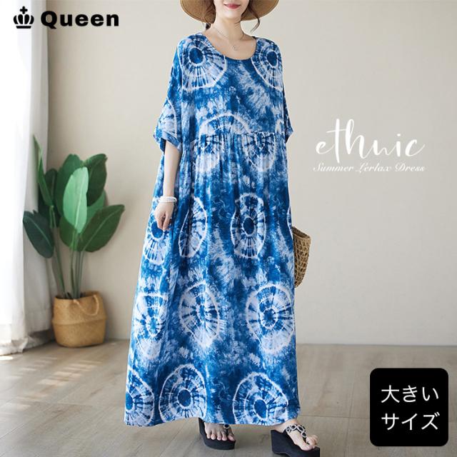 ★☆大きいサイズ レディース 総柄ワンピース ワイドワンピ マキシ丈 半袖 タイダイ柄 サマーワンピ 夏 LL 3L 4L 5L 6L ブルー☆★