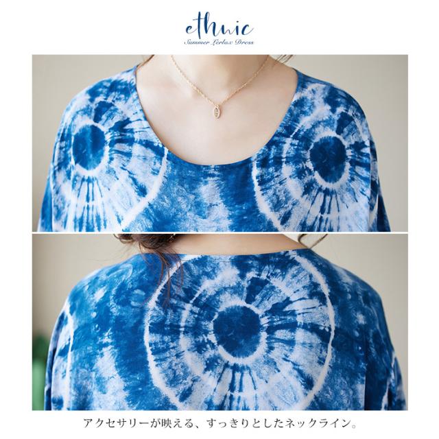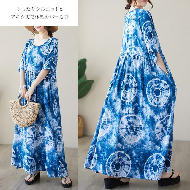 大きいサイズ レディース 総柄ワンピース ワイドワンピ マキシ丈 半袖 タイダイ柄 サマーワンピ 夏 (16805)