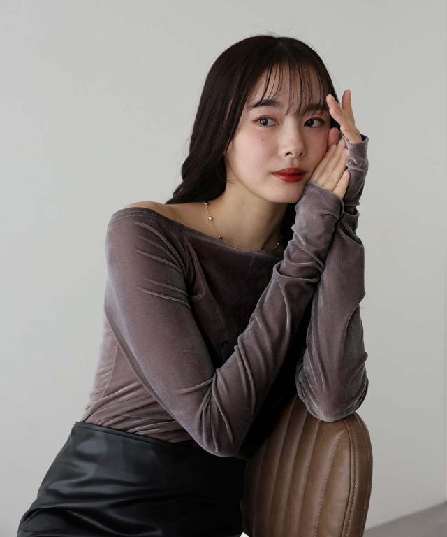 ご好評いただいたオフショルTシャツから、うっすらと透け感のあるシアーベロア素材が登場!