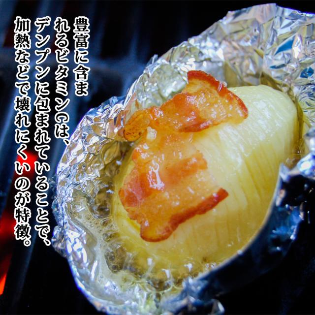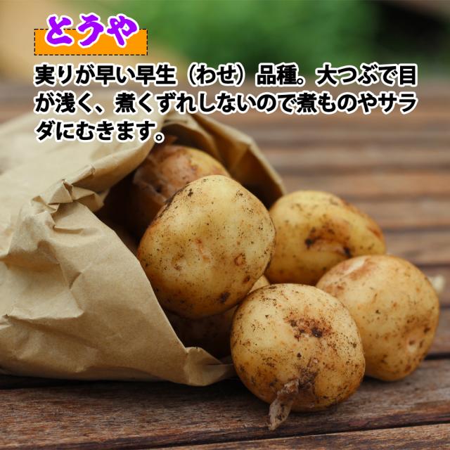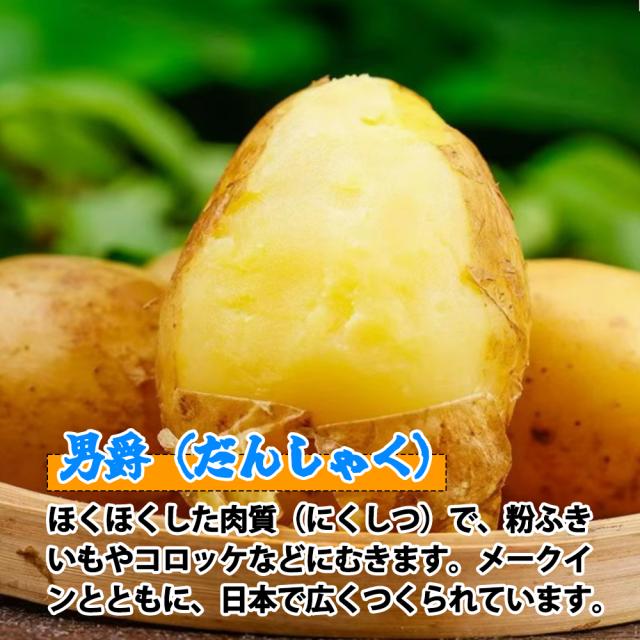 日本のジャガイモの起源でもあり、現在でも代表品種として愛され続けている品種。目が深く果肉色は白、でんぷん含有量が15%と高くほくほくとした食感が特徴。粉ふきいもやマッシュポテトなどさまざまな料理に適しています。