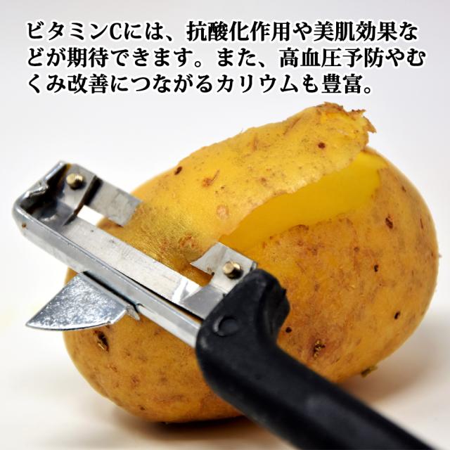 扁球形で皮の色は黄色く目の部分が赤紫色。果肉色は濃い黄色。でんぷん含有量は男爵薯よりも高くほくほくとした食感。煮崩れしやすいので皮付きのままふかしいもにしたり、サラダやコロッケに適しています。果肉の黄色はカロテンを含むため。ビタミンCもほかの品種と比べると多く含まれ、ヘルシーなジャガイモとして人気です。