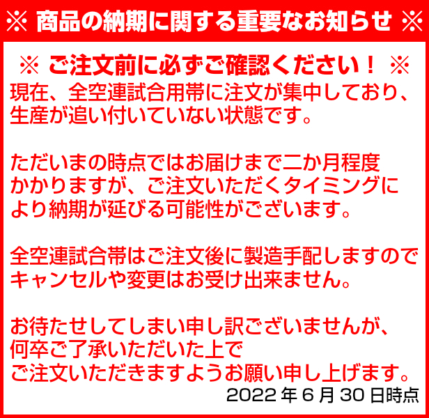 全空連ラベルが付いた帯で、全空連主催の試合用にお使いいただけます。