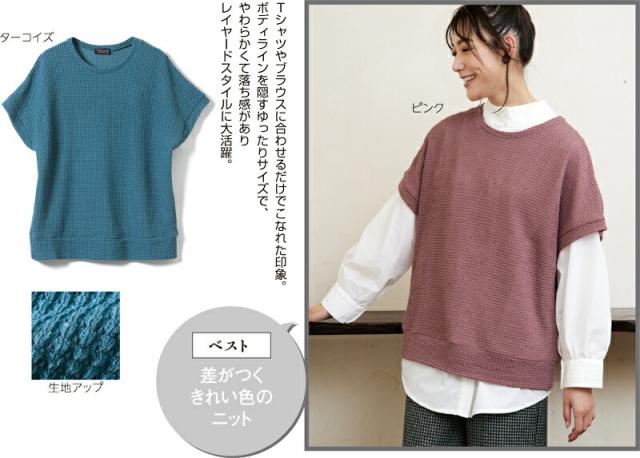 差がつくきれい色のニットTシャツやブラウスに合わせるだけでこなれた印象に。ボディラインを隠すゆったりサイズで、柔らかく落ち感があり、レイヤードスタイルに大活躍。…