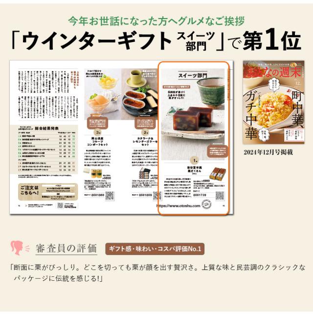 300余年の伝統を誇る、岩手銘菓の岩谷堂羊羹。昔ながらの製法を守り、熟練職人が国産小豆を丁寧に炊き上げて仕立てている。そこに、その名の通り、砕いた栗が「たくさん」ちりばめられ、小豆の風味と栗の食感が見事なバランス。甘さも上品でやさしい余韻が残る味わい。