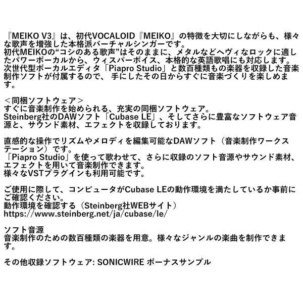 『MEIKO V3』は、初代VOCALOID『MEIKO』の特徴を大切にしながらも、様々な歌声を増強した本格派バーチャルシンガーです。 初代MEIKOの“コシのある歌声”はそのままに、メタルなどヘヴィなロックに適したパワーボーカルから、ウィスパーボイス、本格的な英語歌唱にも対応します。 次世代型ボーカルエディタ「Piapro Studio」と数百種類もの楽器を収録した音楽制作ソフトが付属するので、 手にしたその日からすぐに音楽づくりを楽しめます。 ※記載は商品仕様の一部です。仕様説明不足等の理由での返品はできません。特に適合等は必ずご確認ください。