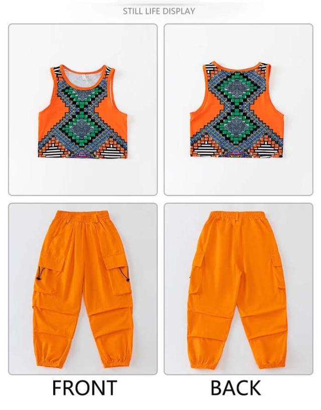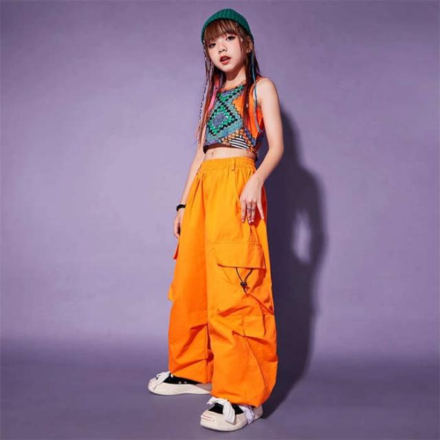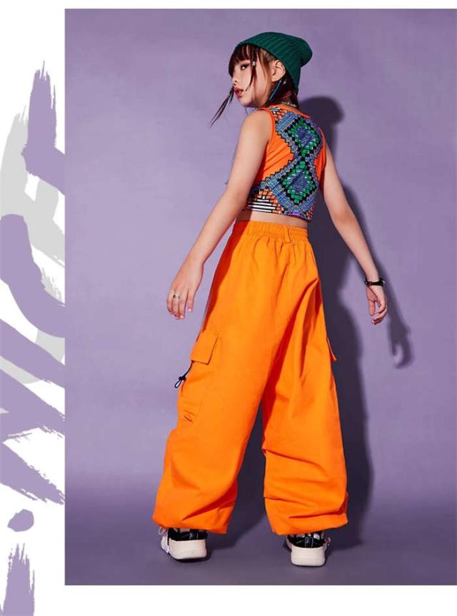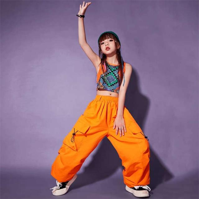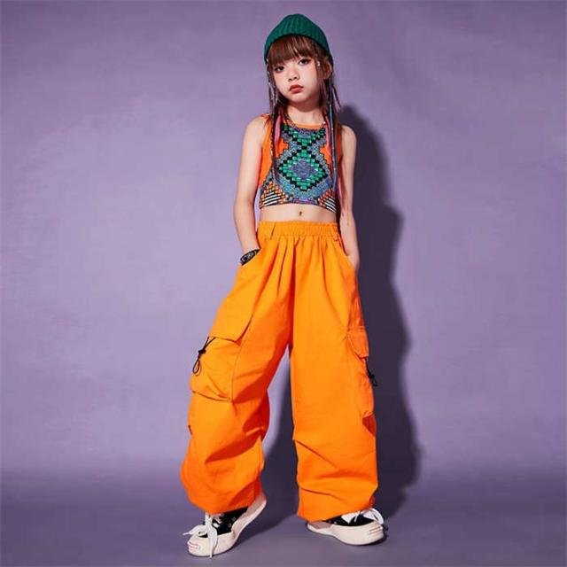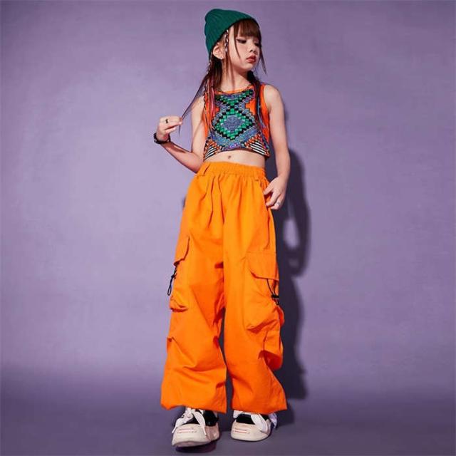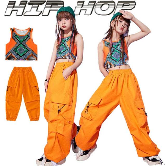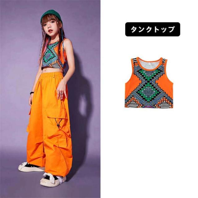 ダンスウェア 女の子 タンクトップ 長パンツ カーゴパンツ オレンジ へそ出し ガールズ ジャズ ダンス衣装 キッズダンスウェア ストリート