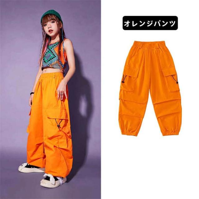 商品名:ダンスウェア 女の子 タンクトップ 長パンツ カーゴパンツ オレンジ へそ出し ガールズ ジャズ ダンス衣装 キッズダンスウェア ストリート セットアップ ダンス衣装 団体服 シンプル 発表会 応援団 ジュニアダンス衣装 演出服 練習着 HIPHOP jazz K-POP レッスン着 イベント カッコイイ ダンス服 110-180cm