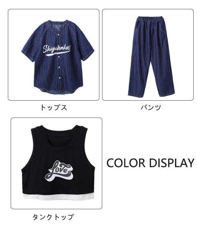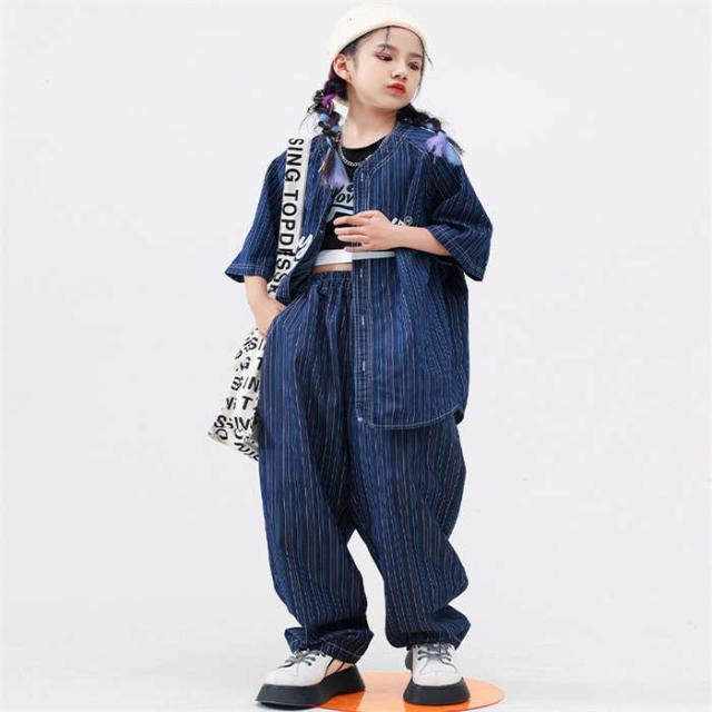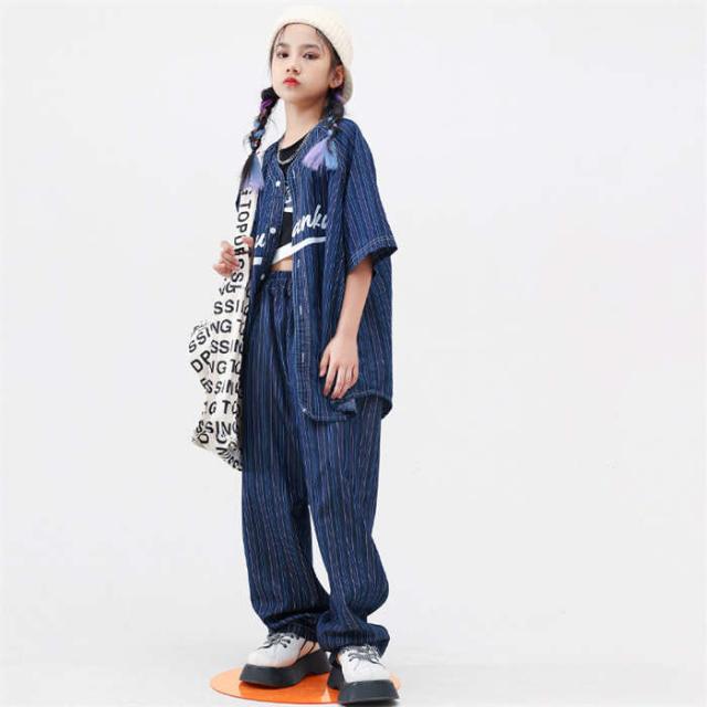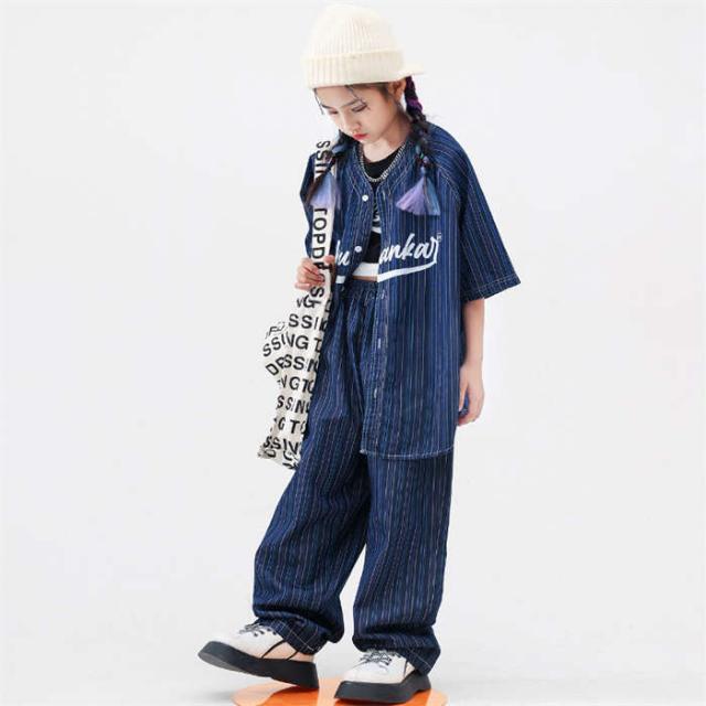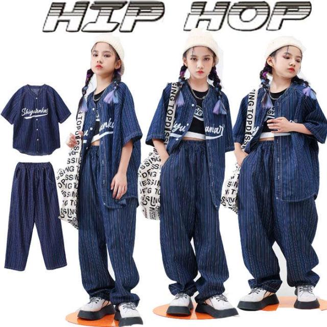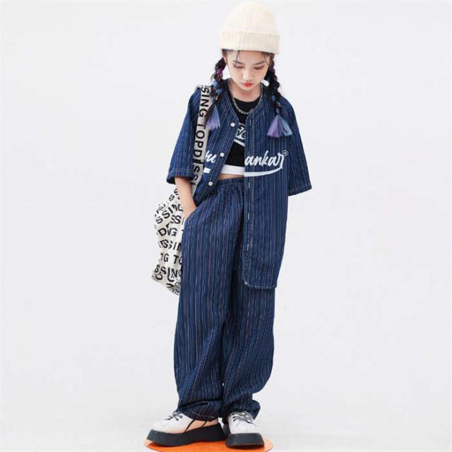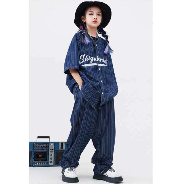 商品名:子供服 デニムシャツ 半袖 紺色 ストライプ柄 ベースボール カジュアルシャツ ボーダー ダンスウェア セットアップ ダンス服 トップス ロングパンツ 長パンツ パンツセット へそ出し ゆったり キッズダンス衣装 ダボパン ジャズダンス ヒップホップ k-pop 演出服 発表会 団体服 運動会 練習着 かっこいい 男の子 女の子 おしゃれ
