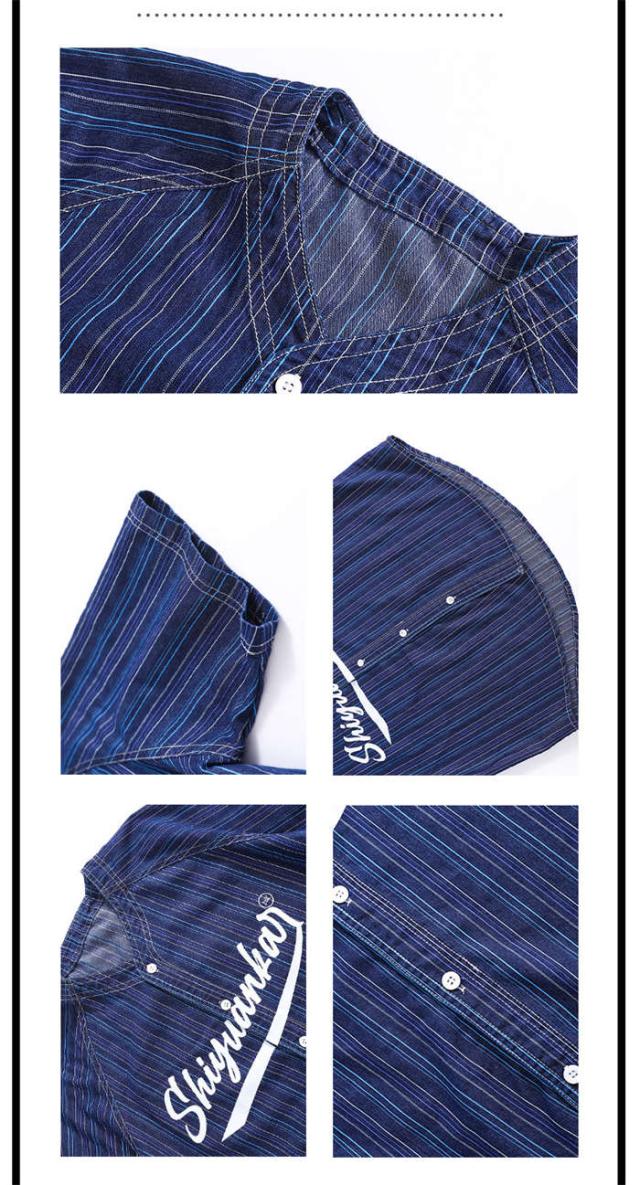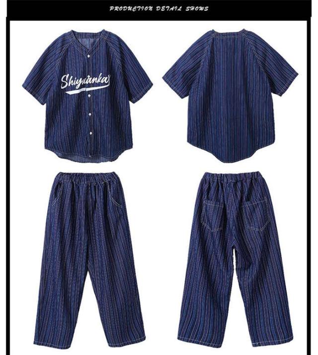 子供服 デニムシャツ 半袖 紺色 ストライプ柄 ベースボール カジュアルシャツ ボーダー ダンスウェア セットアップ ダンス服 トップス ロングパンツ