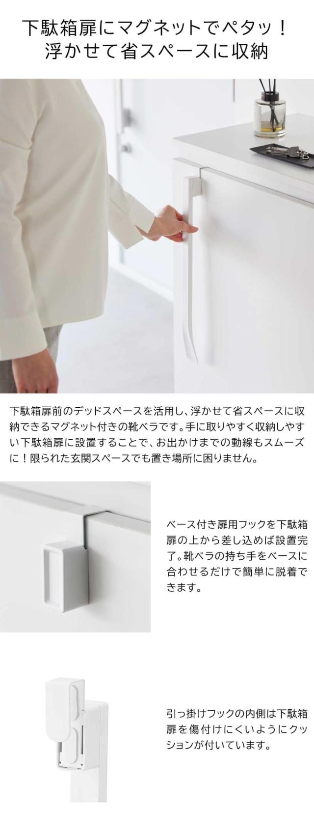 下駄箱扉に浮かせて収納できるマグネット付きの靴ベラ。下駄箱扉にベースフックを引っ掛けて、靴ベラを付けるだけの簡単設置。マグネットが付く玄関扉に直接取り付けも可能。