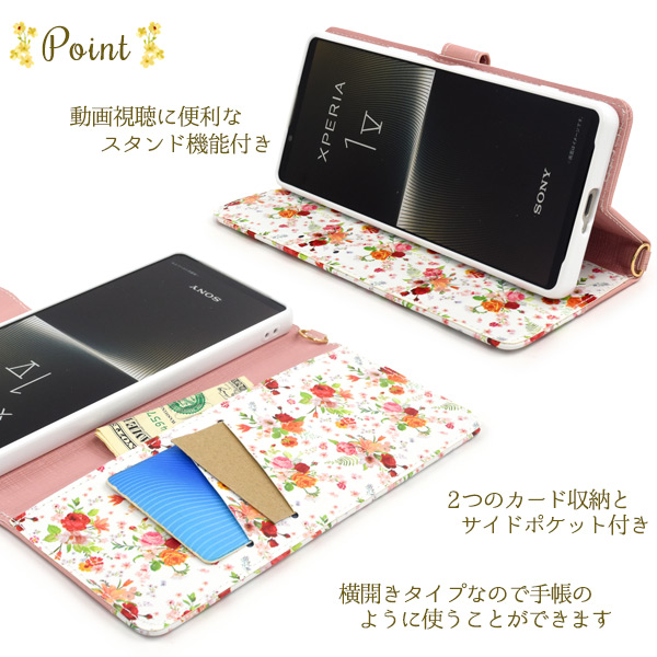 スマホケース Xperia 1 V SO-51D SOG10 A301SO XQ-DQ44 手帳型 花柄 ハッピーブーケ 花模様 お花 かわいい 装着簡単 お洒落 携帯カバー スマホカバー 華やか 携帯ケース 上品 フェミニン 可愛い 小花 エレガント フラワー お洒落 auスマホ au携帯カバー