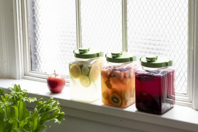 ワンタッチ開閉タイプの注ぎ口。余分なガスを自然に排出するガス抜き弁付き。発酵性のあるものを保存でき、酵素シロップ作りにも最適。いくつか並べてもスッキリな角型デザイン。