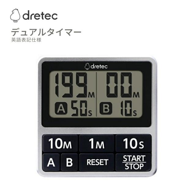ドリテック デュアルタイマー T-635ASVDI 英語表記 シルバー メール便対応 時計機能付 リピート キッチンタイマー スタンド タイマー お風呂 繰り返し カウントアップ