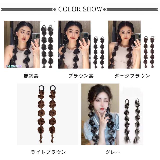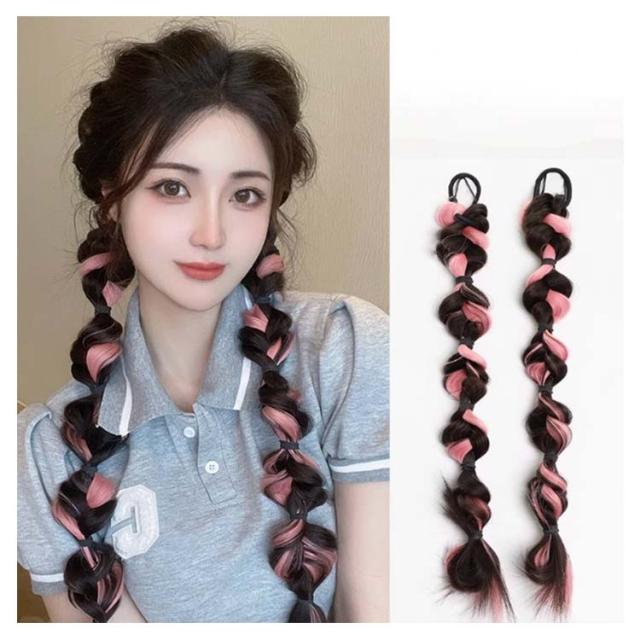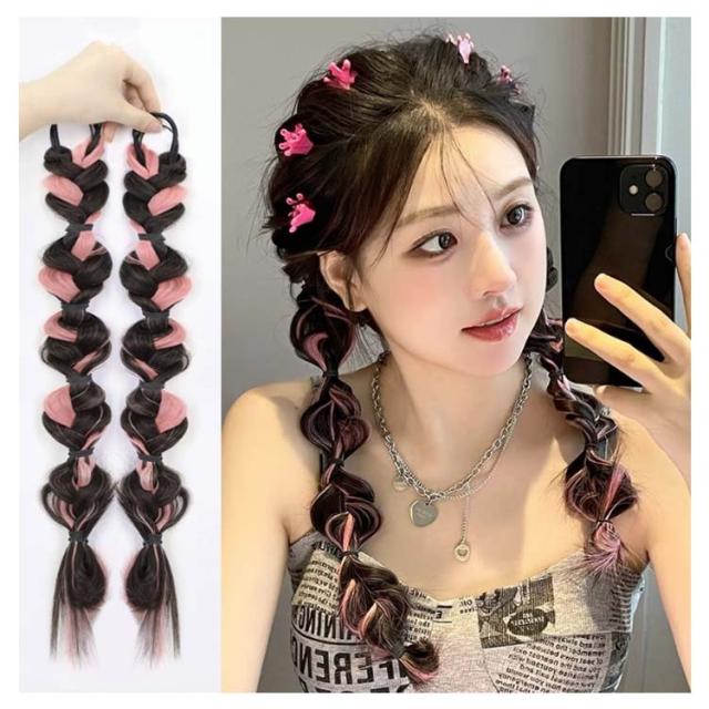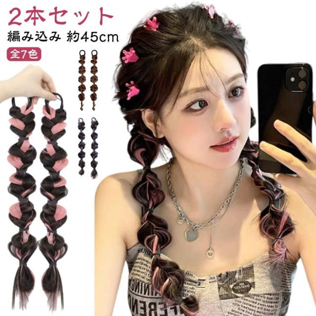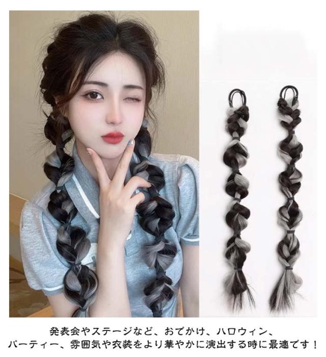 送料無料 2本セット バブルランタン ヘアエクステ 三つ編み エクステ 編み込み カラーエクステ 娘 ダンス お出かけ エクステンション レディース ヘアゴム ポイントウィッグ 簡単 便利 大人 キッズ イベント 付け毛 ツインテール 全7色 45cm