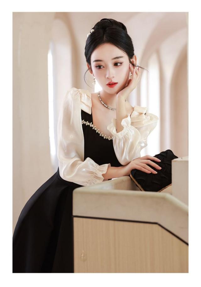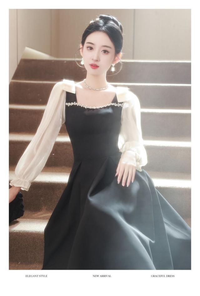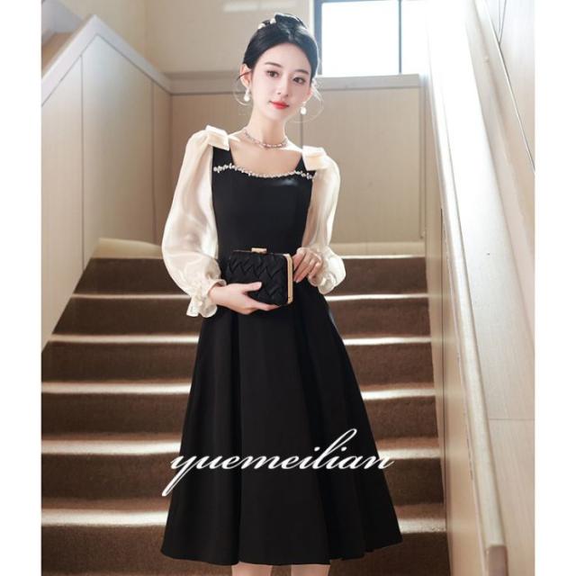 キャバドレスイブニングドレス軽い贅沢長袖シンプル黒誕生日パーティー成人式ミディアムロングドレス卒業式