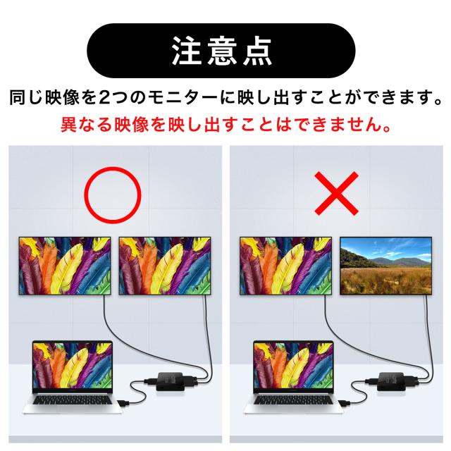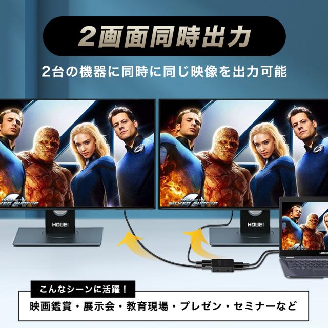 本製品は、1入力2出力で同時に2画面に接続できます。
