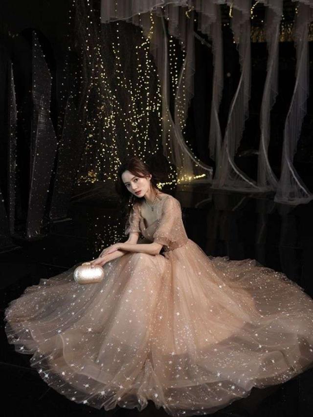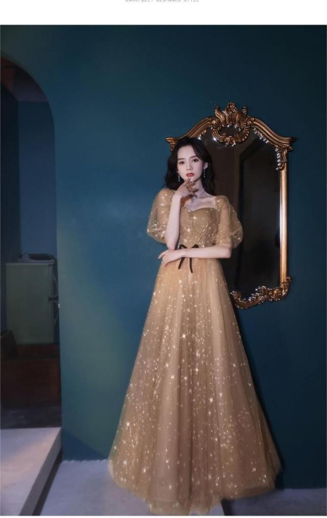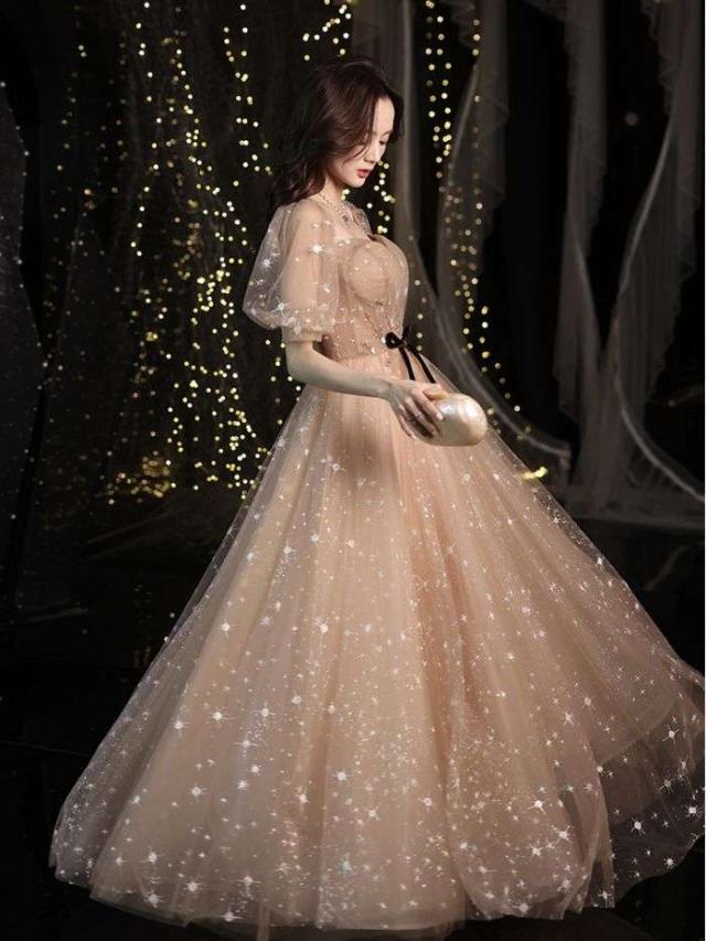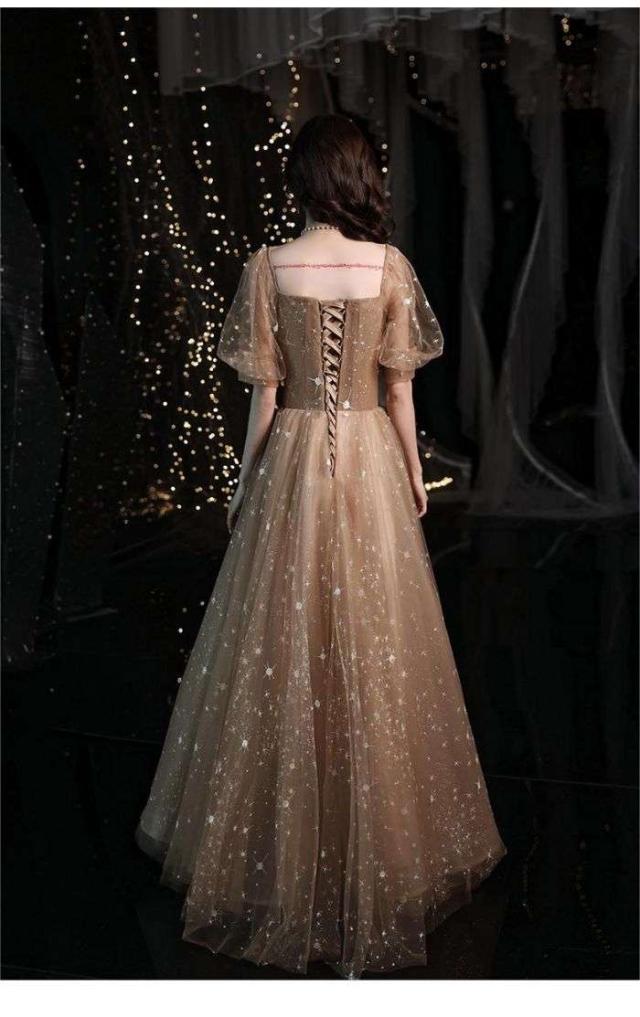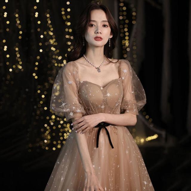 パーティー成人式イブニングドレス女性2024新品気質ブラウン星空ロングワンピースドレス
