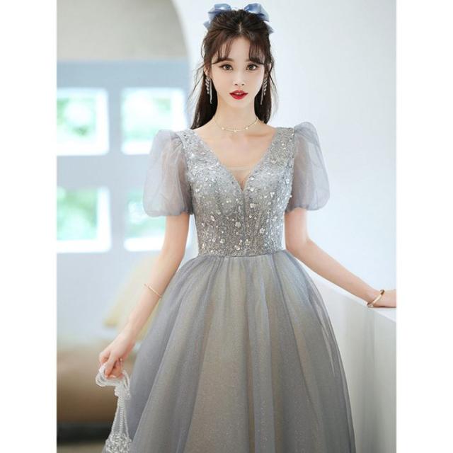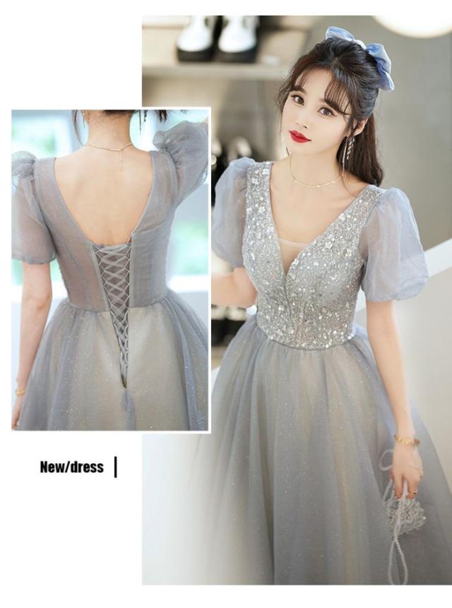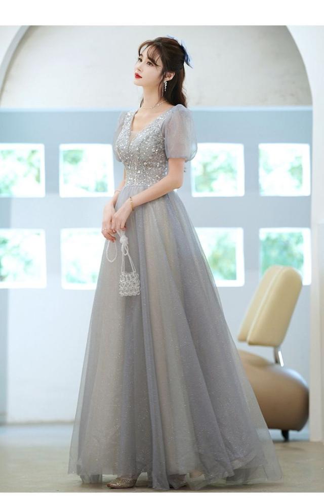 パーティー成人式イブニングドレス女性夏2024新品刺繍ビーズグレーロングワンピース気質ドレス