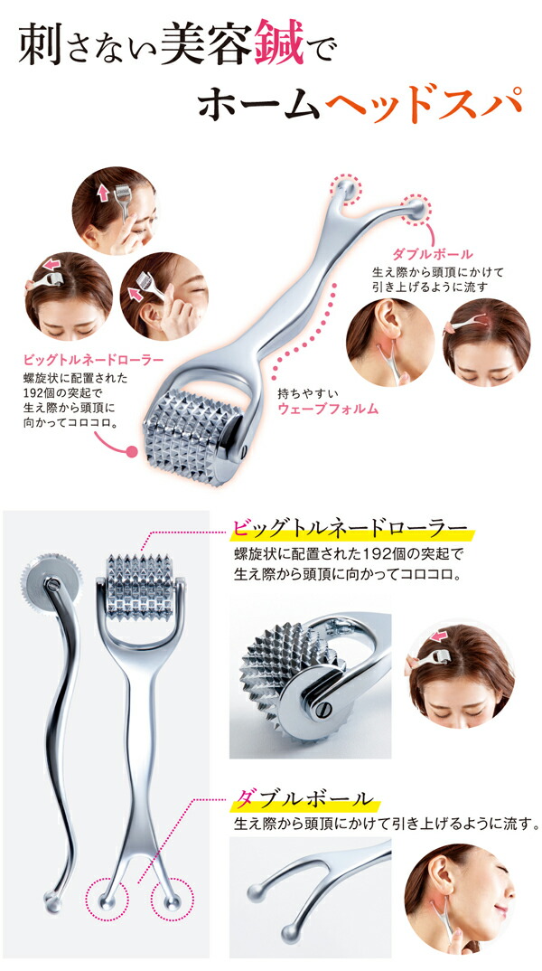 螺旋状に配置された192個の突起で生え際から頭頂に向かってコロコロ。
