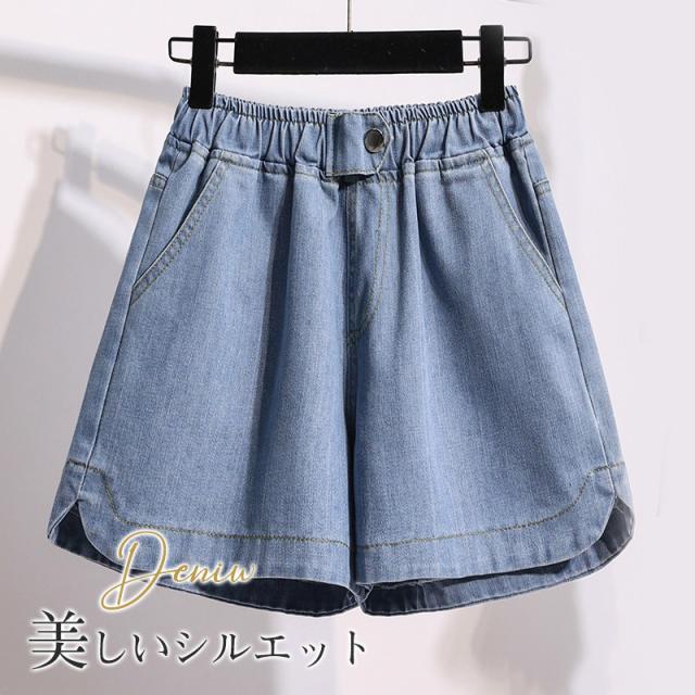 ショートパンツ レディース デニムパンツ ハーフパンツ ウエストゴム ポケット 短パン ゆったり 無地 カジュアル ワイド ジーンズ 着痩せ キレイめ