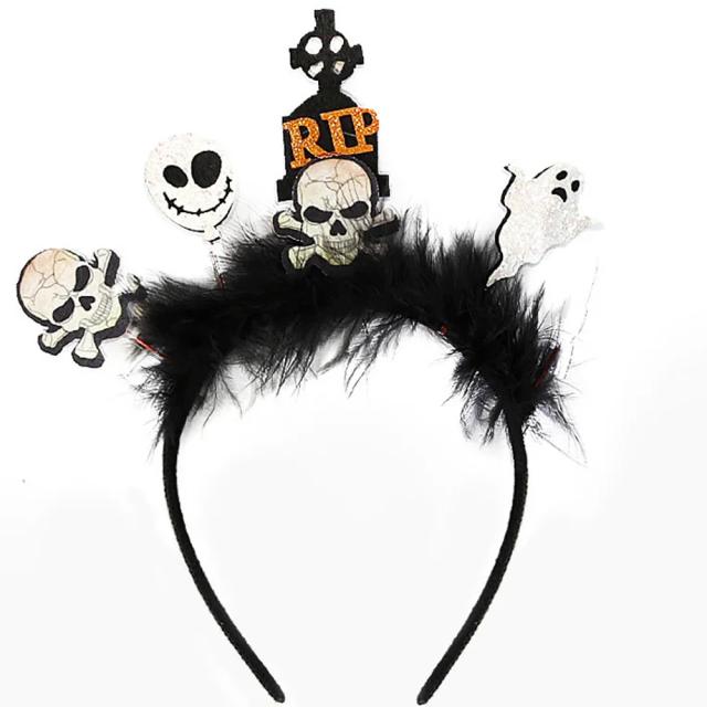 スカルや墓石RIPやゴーストをデザインした黒色ブラックのモヘア付き黒色のカチューシャ。