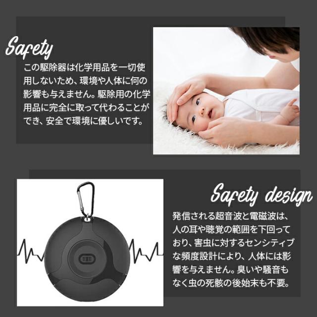 発信される超音波と電磁波は、人の耳や聴覚の範囲を下回っており、害虫に対するセンシティブな頻度設計により、人体システムには影響を与えません。人間やペットにも影響を与えないので、臭いや騒音もなく、虫の死骸の後始末も不要で、安心してお使いいただけます。