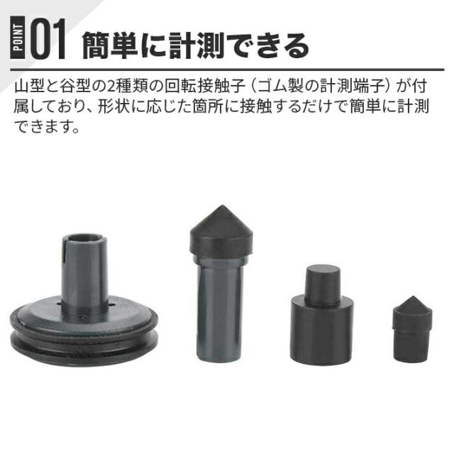 接触式と非接触式の両機能を備えており、状況に応じた方式で回転計測ができます。接触式は、山型と谷型の2種類の回転接触子(ゴム製の計測端子)が付属しており、形状に応じた箇所に接触するだけで簡単に計測できます。
