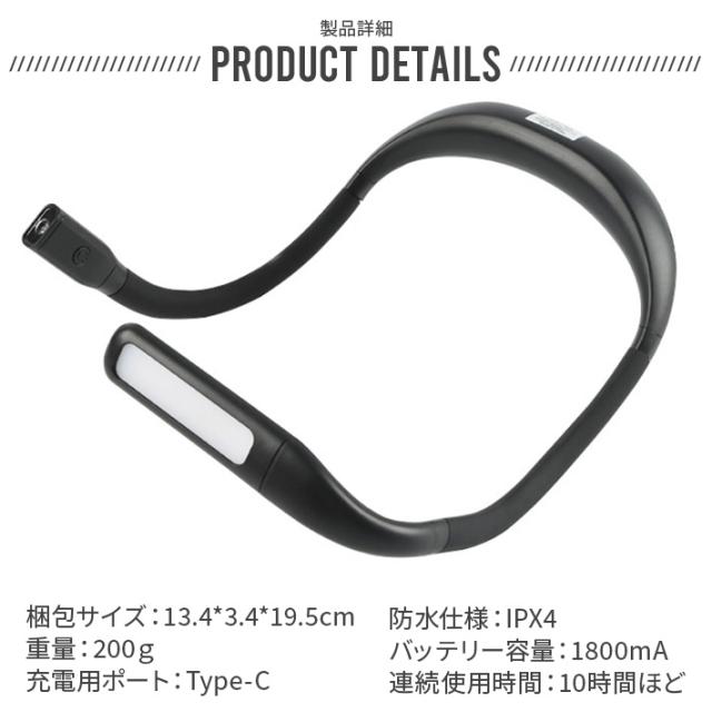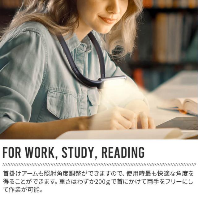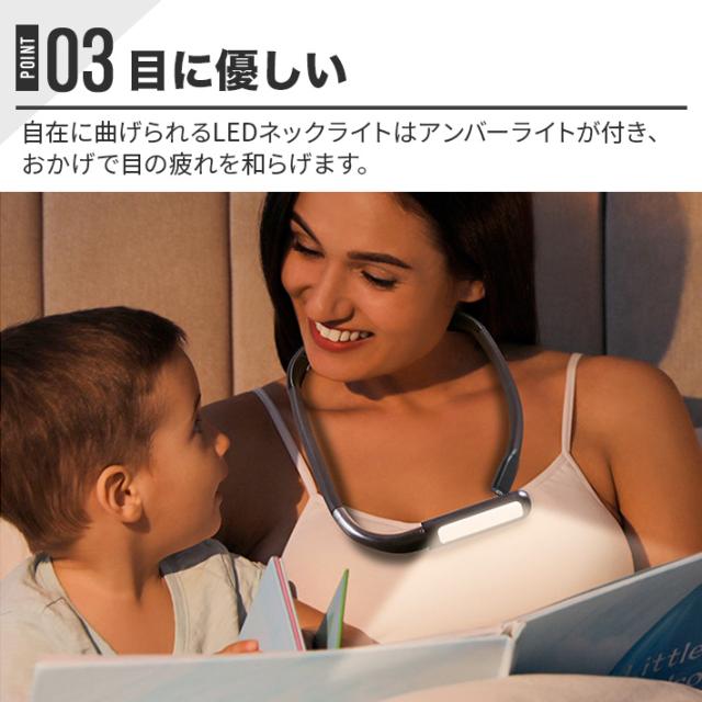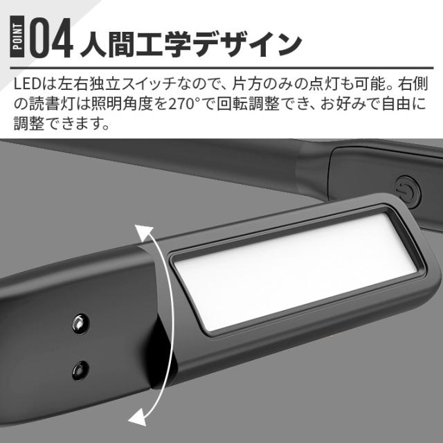 LEDネックライトは自在に曲げられ、アンバーライト付きで目の疲れを軽減します。首かけアームは照射角度を自由に調整できるため、使用時に最適な角度を見つけることができます。重さ約200gで、首にかけて両手が自由になるハンズフリー設計です。LEDは左右で独立したスイッチがあり、片方だけの点灯も可能。右側の読書灯は照明角度を270°回転して調整できます。